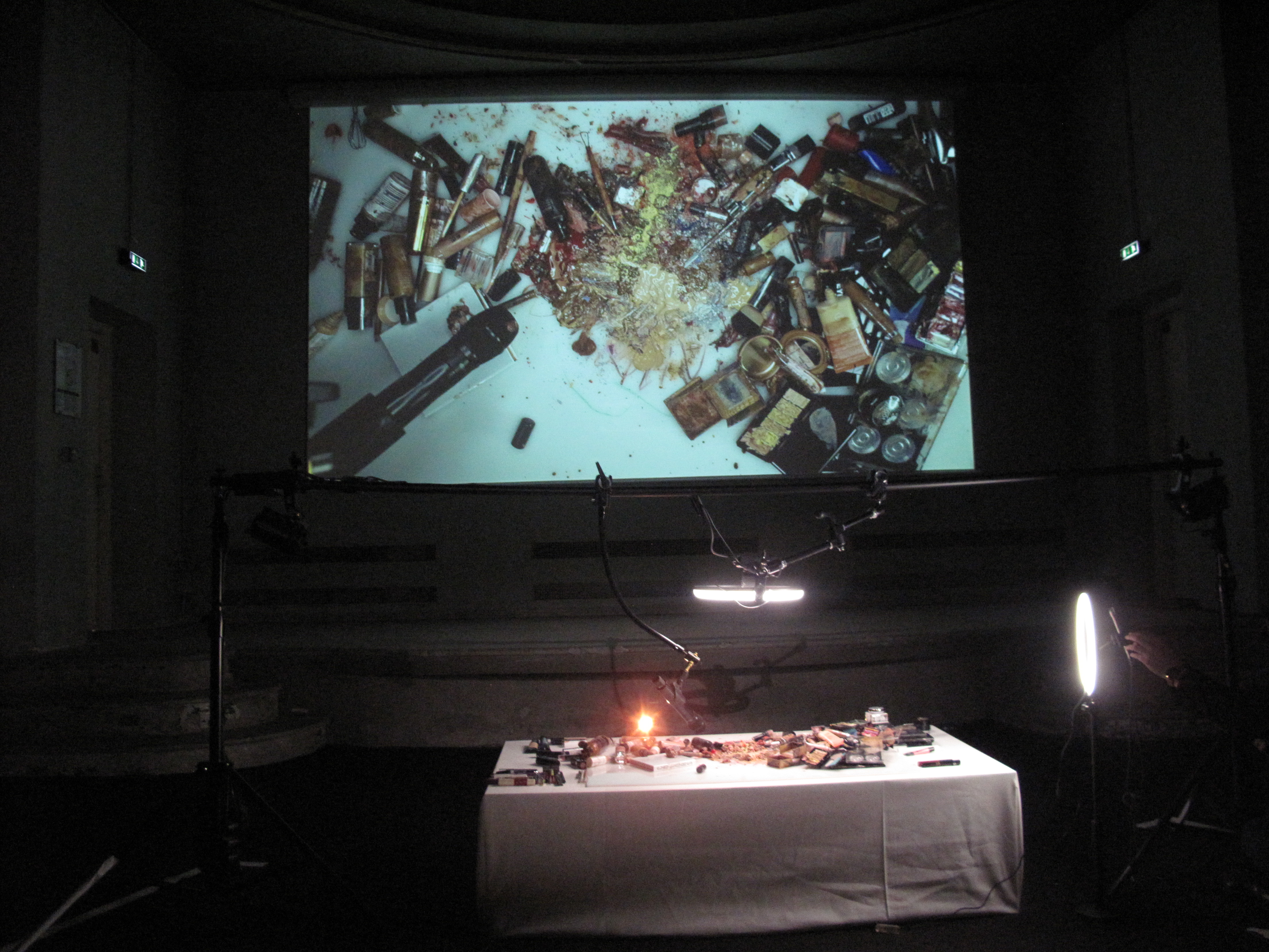 « Make up destroyerz II » est une expérimentation en direct des effets ASMR engendrés par l’amplification sonore et la retransmission vidéo de la destruction de maquillage. Grattées, écrasées, étalées, les crèmes et les poudres offrent une infinité de textures et de sonorités. À travers une gestuelle mesurée, similaire à celle employée pour la présentation de produits, formes et bruitages nous enveloppent et nous captivent, comme peuvent le faire les tutoriels de maquillage et les vidéos virales d’ASMR.Aïda Bruyère sonde les enjeux de la représentation des identités individuelles et collectives dans l’espace public et notamment à travers la danse, les attitudes et les accessoires. Avec la performance « Make up destroyerz II », conçue à l’occasion de son exposition personnelle au Palais de Tokyo, l’artiste développe ses recherches sur le maquillage. Outil de la métamorphose, du déguisement ou du camouflage, le maquillage est aussi pour l’artiste un possible instrument de construction de l’archétype féminin qu’il convient de se réapproprier.